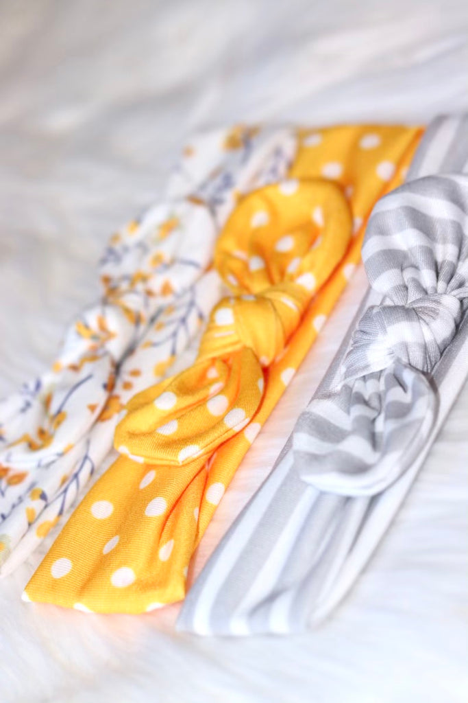 Set includes 3 coordinating topknot headbands. Headbands are adjustable to grow with your baby.